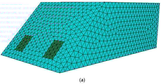 In order to analyze the influence of the horizontal reinforcement of the MJS method on the safety coefficient of the slope, the typical Case 1 of 0.5 m height of reinforcement arrangement, 1m diameter of reinforcement, 2.5 m spacing of reinforcement, 45° angle of slope angle, and 4 m height is selected to calculate the safety coefficient and analyze the damage form. For the reinforced reinforcement after the MJS method, the internal friction angle and cohesion are taken to be two times of the original soil for analysis. According to the simplified analysis principle in Section 2.1, the front part of the model is a free boundary, the bottom and both sides of the boundary are not allowed to occur with normal displacement, and the boundary at the back of the model is not allowed to occur perpendicular to the normal displacement. The tetrahedral mesh is used to divide the model mesh, and taking into account the calculation accuracy and efficiency, the mesh size is taken as 0.1 m, and the corresponding geometrical model is shown in Figure 4 by utilizing the griddle to divide the model mesh.