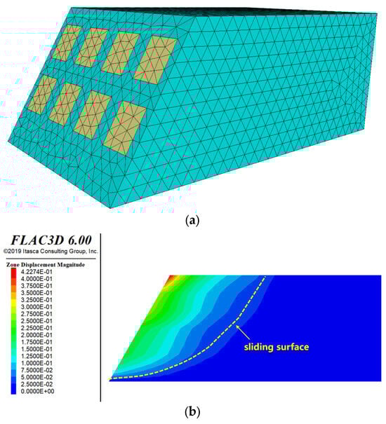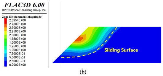 Geometric model of the slope under typical Case 1 and the shear strain increment cloud after analysis: (a) geometric model of the slope and (b) zone displacement cloud.