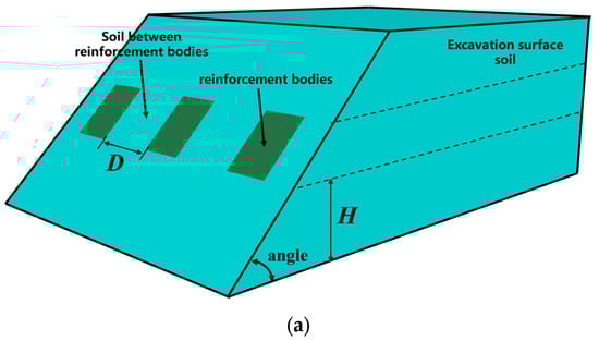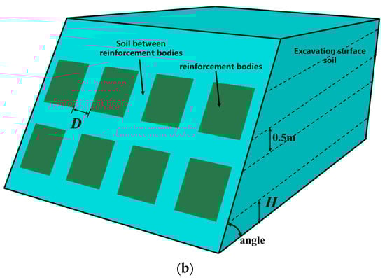 Combined with the general situation of tunnel sloping excavation and the special value of engineering excavation face sloping, take 5°–10° as the interval of value and take the excavation face sloping angle as 45°, 50°, 60°, 70°, 80°, 90° in order to analyze the influence of different excavation face sloping angles on the stability of the excavation face. In Guiqiao Road Station, the height and width of the excavation face in the actual project are taken as the main constraints of the project and the parameters of the solidification arrangement, so the influence of different reinforcement arrangements or installations or construction heights, H; solidification spacings, D; and the number of layers of solidification arrangement on the stability of the excavation face is analyzed. The corresponding geometric schematic diagram is shown in the following Figure 6.