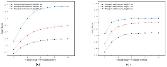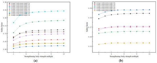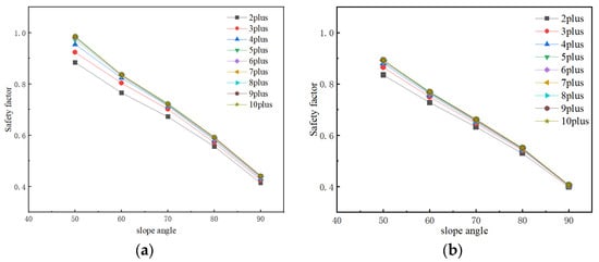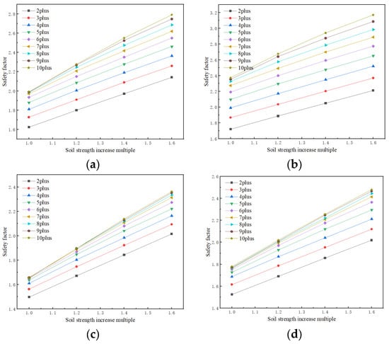 In the actual project, the different strength of the plus MJS zone has a non-negligible influence on the stability of the slope and the project cost. In the process of modeling and analysis, the calculation is carried out in the form of increasing the cohesion of the soil and the internal friction angle, and the strength of the plus MJS zone will be expressed as its strength multiplier for calculation based on the original excavation face soil parameters. As a result, the safety coefficients under different angles of the excavation face under each case can be obtained with the variation curve for the strength parameter of the added MJS zone, as shown in Figure 11. A comprehensive analysis of various cases under each slope release angle shows that the safety factor of the excavation face under various cases increases with the increase in the MJS zone multiplier.