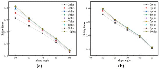 According to the general construction parameters of the pipe shed method of excavation in the actual project, the slope angle of the excavation face is selected as 45°, 50°, 60°, 70°, 80°, and 90° for analysis, and the change in the slope safety factor with the slope angle under different cases is shown in Figure 7 and Figure 8. Under different cases, the slope safety coefficient decreases continuously with the increase in angle, but with slight differences.