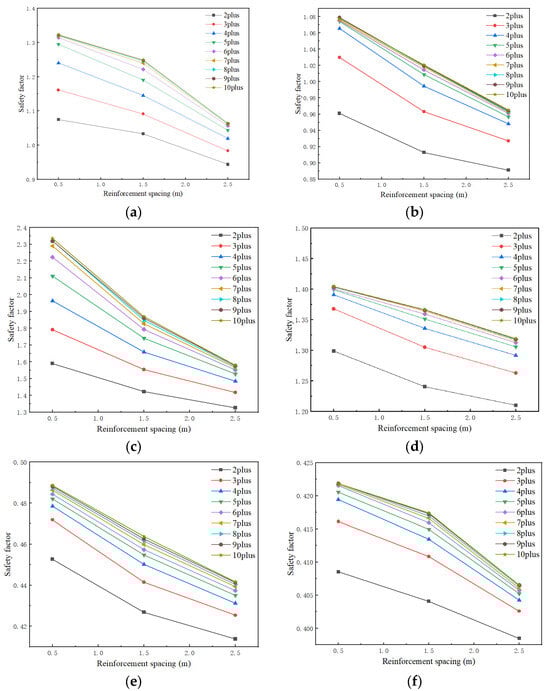 In Figure 9, the change of the slope safety coefficient with reinforcement spacing at different slope release angles is presented when the soil at the excavation face is only arranged with a single-layer reinforcement zone. Under most conditions at different angles, the safety coefficient decreases with the increase in reinforcement spacing, so when the height of reinforcement arrangement is low, the influence of the reinforcement spacing on the safety coefficient of the excavation face is more prominent. Therefore, in the construction of the project, in order to set the MJS zone at the lower height so that it can play a better reinforcement role, it should be arranged more densely.