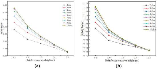 Figure 10 shows the change curves for the safety factor of the excavation face with the height of reinforcement in different cases under different slope release angles of the excavation face. Analyzing the change curves under each condition, it can be concluded that the safety coefficient of the excavation face shows a decreasing trend with the increase in the reinforcement height, and the magnitude of the decrease gradually decreases (i.e., the absolute value of the slope of the curve becomes smaller and smaller), which indicates that after the height of the MJS zone arrangement exceeds a certain value, the MJS zone will hardly contribute to the stability of the excavation face, so it is necessary to choose a reasonable height for the MJS zone arrangement.