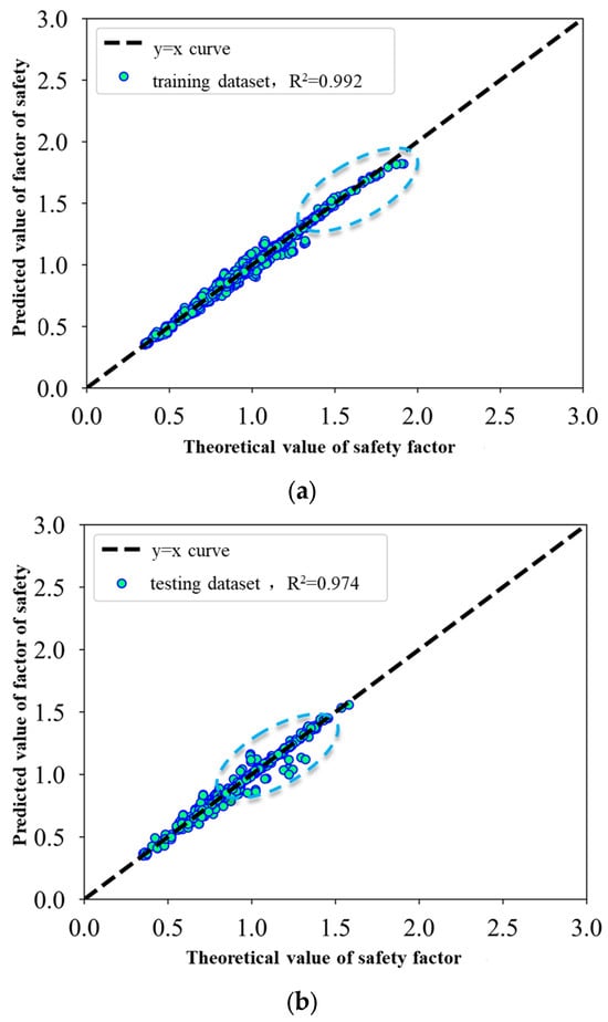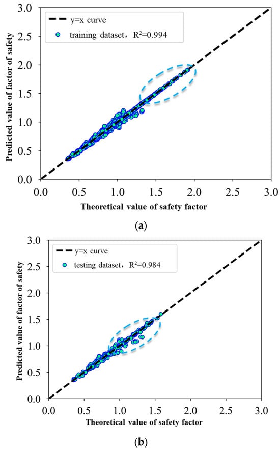 In order to evaluate the difference between different machine learning models, the database containing 2025 data samples of slope safety coefficients of single-layer consolidated slopes is selected as the sample data, which are fed into the XGBoost and LGBM machine learning models, and the detailed results of the machine learning models are shown in the following pictures after training. It can be seen that the correlation coefficient R2 of the database is greater than 0.9 when the different models are trained, indicating that the different training models can obtain good results in predicting the slope safety coefficient. The correlation coefficients of the training and testing databases of the XGBoost model are 0.994 and 0.984, respectively, which shows that the model achieves good results; the correlation coefficients of the training and testing databases of the LGBM model are 0.992 and 0.74, respectively, which shows that the accuracy of the trained model is not as good as that of the XGBoost model.