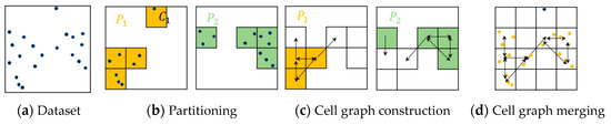 Figure 4 uses an example to illustrate the three main phases of RP-DBSCAN. Since the cell C1 is labeled as a non-core cell in Figure 4b, it will be excluded in the next phase of cell graph construction in Figure 4c. Figure 4d illustrates the expansion of the clusters in the process of cell graph merging.