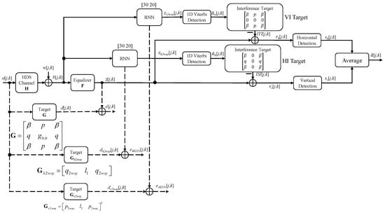 In Figure 2, to create the signal a[j,k], the user signal u[k] is modulated. Subsequently, a[j,k] is stored in the HDS channel. The readback signal from HDS is b[j,k], which is distorted by the 2D interference and Gaussian noise w[j,k]. The received signal b[j,k] was supplied in three parts. The first is the equalizer part, which converts b[j,k] into z[j,k]. Signal z[j,k] is approximate to the desired signal d[j,k], which is interfered with by the 2D target G. The second is the RNN with horizontal detection creating the signal zv2way[j,k]. Signal zv2way[j,k] is similar to the desired signal dv2way[j,k], which is interfered with by the 1D target Gv2way. The third is the RNN with vertical detection. Signal zh2way[j,k] is approximate to the desired signal dh2way[j,k], which is interfered with by the 1D target Gh2way. After the RNN converts the received y[j,k] into signals zv2way[j,k] and zh2way[j,k], which include 1D interference, we can use the conventional 1D VA to detect zv2way[j,k] and zh2way[j,k] in v[j,k] and h[j,k], respectively. Thereafter, the signals v[j,k] and h[j,k] pass through the VI and HI targets to achieve the estimated signals of the ULI and LRI, respectively, as follows: