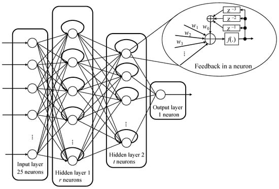 We used the RNN structure shown in Figure 3. It includes an input layer, two hidden layers, and an output layer. Because the received signal b[j,k] is used as the vector y, we created 25 neurons in the input layer. We designed m and n neurons in hidden layers 1 and 2, respectively, and used a neuron in the output layer. To select r and t, we implemented a simulation by varying their values. In this experiment, we simulated the horizontal detection branch of the model, as shown in Figure 2. The results are summarized in Table 1. Based on the performance shown in Table 1, we selected r = 30 and t = 20 to obtain the best BER performance. To create a feedback line for each neuron, we used three delay terms: z−1, z−2, and z−3. With feedback lines in the neurons, an RNN is an advantageous technique for processing sequential data. Similar to the 2D data received from the output channel, the RNN has memory to store the previous state information. Therefore, it can provide better predictions than the previous model. In addition, we used the hyperbolic tangent function for the activation function f(x) = 2/(1 + exp(−2x))−1.