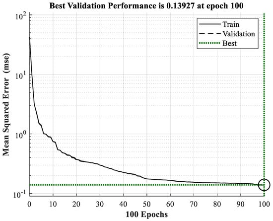 To test our model, we created 10 pages. The signal a[j,k] was passed through the HDS channel to create the signal b[j,k]. The signal b[j,k] was supplied to two RNNs and equalizer F to create the signals z[j,k], zh2way[j,k], and zv2way[j,k]. Then, zh2way[j,k] and zv2way[j,k] were handled as in Section 3 to obtain the ISI[j,k] and ITI[j,k]. We mitigated ITI[j,k] from z[j,k] to create rh[j,k]. Simalarly, to create rv[j,k], ISI[j,k] was subtracted from z[j,k]. rh[j,k] and rv[j,k] were detected by 1D VA following horizontal and vertical directions to create the signals sh[j,k] and sv[j,k], respectively. sh[j,k] and sv[j,k] were put through the average function to achieve the signal [j,k]. [j,k] was restored into the original signal [k] using demodulation. Subsequently, we counted the error bits (different bits between u[k] and [k]) to calculate the BER performance. We set up a dataset with 60% training and 40% validation data and trained the RNN with 100 epochs. Figure 4 and Figure 5 show the learning curves of the RNNs in the horizontal and vertical detection branches, respectively. Finally, we used the mean square error (MSE) as the loss function, which is calculated as below.