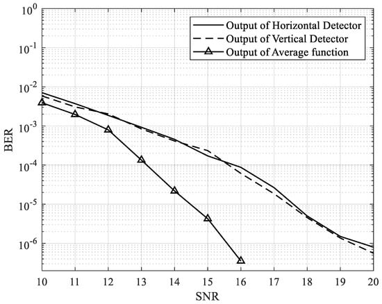 Figure 6 presents the BER performance of the output signal from the first branch, second branch, and combined branch (the average function branch). The outputs of the first and second branches are similar to the signal a[j,k]. The output of the combined branch can achieve a gain of 2 dB at a BER of 10−4. The output of the combined branch can improve the BER performance because the combined branch can balance the information from horizontal and vertical detections.