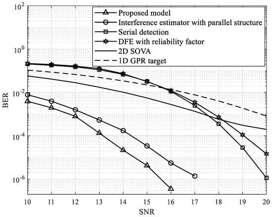 In the following simulation, we compared the proposed model with those of previous studies. Figure 7 presents an interference estimator with a parallel structure, which corresponds to the model introduced in []. Serial detection was implemented following the methodology outlined in []. Furthermore, a decision feedback equalizer (DFE) with a reliability factor was simulated as described in []. 2D SOVA and the 1D GPR target, which were introduced in [], respectively, are also compared with our model. The results demonstrate that the proposed model can improve the BER performance of HDS systems. In particular, it can achieve a gain of ~1 dB at BER = 10−4 compared to the model in [].