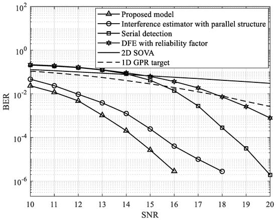 Next, we set up 10% misalignment of the HDS channel. Figure 8 demonstrates that the proposed model still achieves the best performance. The gain of the proposed model is 1 dB at a BER of 10−4. When increasing the misalignment, the ITI and ISI also grow. However, by estimating the increase in the ITI and ISI, our proposed model can compensate for this change and improve the BER performance of HDS systems. With 2D SOVA and 1D GPR target models, we can see that the performance changed more when increasing the misalignment because the 2D SOVA and 1D GPR target models did not have the ITI/ISI estimators.