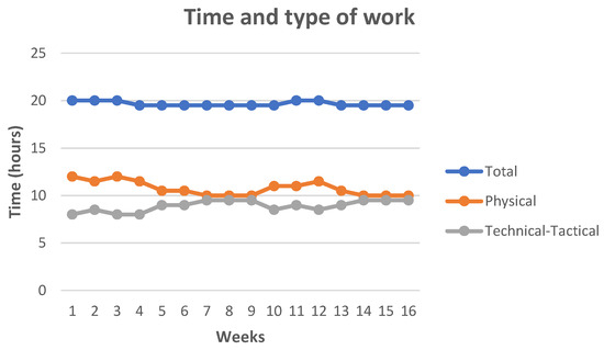 The typical work week averaged 22.5 (Figure 1) hours of training (excluding competition). It included three double training sessions, 150 min of technical–tactical work (46.15%) (morning) and 180 min of physical work (53.85%) (afternoon).
