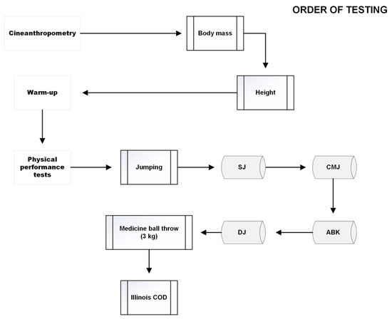 The tests were conducted in a specific order (Figure 3), beginning with the squat jump (SJ), followed by the countermovement jump (CMJ), the Abalakov jump (ABK), the drop jump (DJ), the medicine ball throw (using a 3 kg ball) and concluding with the Illinois agility test with change of direction (COD).