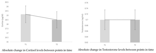 In Table 2, we can observe the percentage and absolute changes between the initial test (T1) and the final test (T2) for all hormone measures and the index that relates them. The main changes observed were a decrease (−3.470%) in C levels and an increase in T levels (2.945%). These changes imply that the T:C ratio has improved by 10.574%, as is illustrated graphically in Figure 4 and in Table 2. Although, as can be seen, the p-values are greater than 0.05, there is no statistically significant difference.