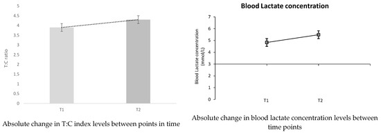 In this case, we see that the T:C ratio increases as was predictable with the data provided for T and C. The T:C ratio represents the balance between anabolic and catabolic processes and has been suggested by various researchers as an indicator of the training load [28,29,30,31] and could be a useful tool for intervening in its planning, before pathological physiological alterations occur in athletes [29,30]. The increase in this ratio (10.574%) (Figure 4) indicates a predominance of anabolic processes, which lead to an increase in performance (overcompensation) [28,29,31,32]. It should be noted that there is some debate surrounding the T:C ratio and that it is a parameter that requires more research [34,35]. Some authors even consider that the T:C ratio does not indicate metabolic balance [36].