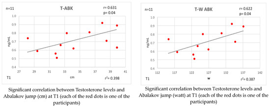 The percentage change for hormone levels (Table 2) are 2.945% for T, 3.470% for C and 10.574% for the T:C ratio. As for the performance results, the percentage changes (Table 3) are for the SJ jump—4.0% ± 11.3%, for the CMJ jump—3.0% ± 2.2%, for the ABK jump—2.2% ± 3.1%, for the DJ jump—3.5% ± 6.6%, for the MBT—0.7% ± 11.0% and for the agility test—1.8% ± 3.8%.