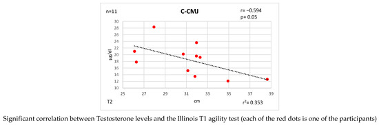 The correlations between T and the agility test at T1 (high) showed the expected pattern of correspondence, with a considerable magnitude of change, indicating a high causal probability of the changes produced not being influenced by chance and that being negative indicates that the level of T influences this type of test inversely proportional to the reduction in test times. The Illinois agility test is considered a standard agility test [8] due to its high validation and reproducibility [9,10]. It is used to assess speed and agility abilities, including reaction time, acceleration, deceleration and change of direction [11], and it is used to quantify changes in directional ability [12]. The intraclass correlation coefficient and standard error of measurement values for the test are 0.96 (95% CI, 0.85–0.98) and 0.19 s, respectively. The validity of the COD IAGT has been assessed with the t-test, yielding a correlation coefficient of r = 0.31 (95% CI, 0.24–0.39) and a significant p-value < 0.05 [9]. These findings suggest that the COD IAGT is a reliable and valid test for assessing agility.