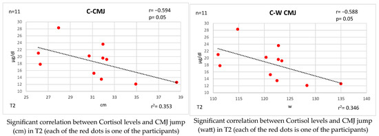 At time T2, C presents significant negative correlations with CMJ jump (high), with a significant magnitude of change, indicating that there is a low probability that the changes are intervened by chance, and it can be concluded that the lower the level of C, and practically the same level of T, the lower the strength and explosiveness.