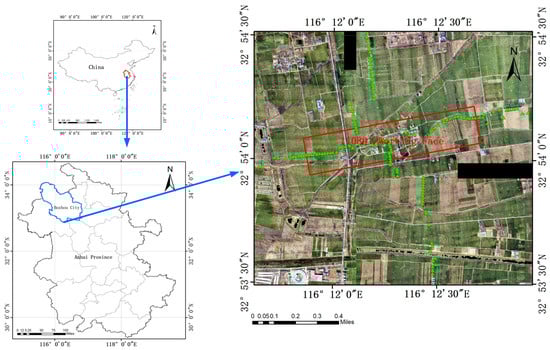The research domain chosen for this investigation was the initial excavation zone (110,801) situated in East Area 1 of the Banji Coal Mine, Anhui Province. The first mining face 110,801 extends over a strike distance of 1237 m and displays a dip width of 280 m. The angle of inclination of the coal seam varies from 0° to 15°, with an average dip angle of 8°. Additionally, the coal seam manifests a thickness ranging from 1 m to 3.7 m, averaging at 2.5 m. The thickness of the overburden bedrock spans from 30 m to 330 m, with an average thickness of 130 m. The depth of the lower boundary of the coal seam ranges from 650 m to 834 m, with an average depth of 767 m. To enable monitoring of surface deformation, two observation lines, one along the strike and the other along the dip, were established above the surface. The strike observation line accommodated a total of 98 monitoring points, spaced between 20 m and 60 m apart. Similarly, the dip observation line included 92 monitoring points, spaced between 20 m and 40 m apart. The precise geographical location of the research area is illustrated in Figure 1.