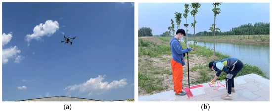 The SAR data utilized in this study were acquired from ESA’s Sentinel-1A satellite, equipped with a C-band microwave sensor that revisits the area every 12 days. A total of 38 SAR images from ascending orbits, spanning the period from 10 April 2021 to 28 June 2022, were carefully chosen for this study. All pertinent parameters related to these SAR images are presented in Table 1. Additionally, the external DEM used in this study was selected from the shuttle radar topography mission (SRTM) data, providing a resolution of 30 m. The UAV data were acquired on two specific dates: 10 April 2021 and 28 June 2022, utilizing the DJI Matrice 300 RTK UAV (DJI, Shenzhen, China) equipped with a five-lens V2 tilt camera(SHARE, Shenzhen, China). The outdoor data collection scenario for the drone is shown in Figure 2. The drone missions were carried out at a skyward elevation of 159.8 m, with a ground resolution of 2.5 cm. During the flights, an 80% heading overlap rate and a 70% side-to-side overlap rate were achieved, ensuring comprehensive coverage of the study area. The main parameters pertinent to the UAV data collection are listed in Table 2. The monitoring points were subjected to routine surveillance for surface settlement using precise level and GNSS measurement techniques, conducted on the respective dates of 10 April 2021 and 28 June 2022, thus obtaining the plane coordinates and elevations of the monitoring points for both phases. The leveling survey was conducted to meet the precision standards of a third-class leveling survey, ensuring that the average elevation error for each survey did not exceed 3.5 mm. Furthermore, the total error in elevation observations for each kilometer after leveling fell within the specified range of ±6.0 mm, as stipulated by the requirements for a third-class leveling survey. The planar connection measurement was conducted using GNSS technology, with a maximum error in the planar point position not exceeding 2.0 cm and an average error remaining within 1.5 cm. These measurements align with the precision requirements of the subsidence observation project.
