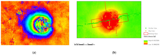 Illustration of the D-InSAR processing: (a) the wrapped phase; (b) vertical deformation.
