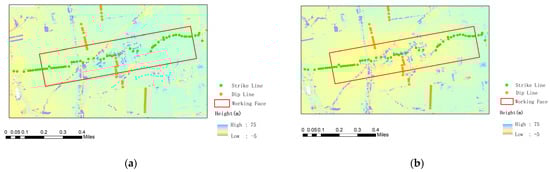 The simulation experiment was conducted considering the geological mining conditions in the study area. The parameters of the probability integration model were set as follows: subsidence coefficient (q) = 1.2, horizontal movement coefficient (b) = 0.22, tangent of major influence angle (tanβ) = 2.37, mining influence propagation angle (θ₀) = 88. Additionally, the deviation of the inflection points (s1, s2, s3, s4) was set to 50 m.