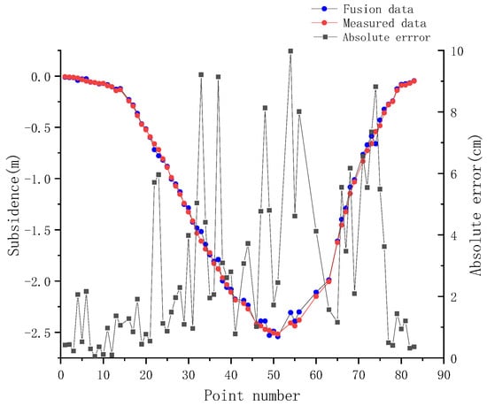 The settlement of the fused monitoring points was determined by integrating the two types of monitoring data, as per the procedure outlined in Section 2.4 of this article. Subsequently, the settlement was compared with the leveling data, as depicted in Figure 8 and Figure 9. Following the analysis, it was found that the absolute error between the settlement of the fused monitoring points and the measured leveling settlement fell within a range of 10 cm. The simulation experiments conducted in Section 2.6 of this paper demonstrated that the data source error was within 10 cm, fulfilling the requirements for the parameter inversion in the probability integration method of mining subsidence. Consequently, the fused data were suitable for mining subsidence parameter inversion. When compared with mining subsidence parameter inversion using UAV data alone, the parameter inversion based on fused data showed higher accuracy in monitoring the subsidence basin edge. This improvement is conducive to achieving more accurate parameter inversion.