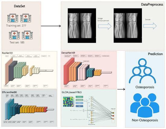 Machine learning, a subset of artificial intelligence (AI), is concerned with the development of algorithms and models that enable computers to learn and make predictions or decisions without explicit programming. In recent years, there has been growing interest in the use of machine learning-based methods for osteoporosis screening, as they offer convenient and efficient diagnosis for patients. Researchers have applied various machine learning models, such as support vector machine, random trees, and XGBoost, to achieve automatic analysis, prediction, and diagnosis of osteoporosis and osteopenia [4,5,6]. While these methods are effective and interpretable, their learning ability is not robust enough for large-scale datasets, raising questions about their performance on multi-center, large-scale datasets. Deep learning, a popular machine learning technology, has emerged as a promising approach for osteopenia and osteoporosis screening [7]. By leveraging deep learning techniques, researchers have proposed methods that can automatically extract features from imaging data and perform screening for osteopenia and osteoporosis [8,9,10]. These deep learning methods demonstrate excellent classification performance and have made significant advancements in detecting osteoporosis based on radiographs in various regions, such as the chest and lumbar spine. However, these methods often require a substantial amount of data, and overfitting can occur when the sample size is small. Additionally, the complex parameter settings and network structures of deep learning systems pose challenges in model training [11].
