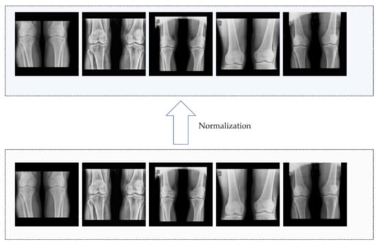 This dataset consists of 239 images, which include 36 images with no findings, 154 images with osteopenia, and 49 images with osteoporosis. To address the issue of an imbalanced sample distribution in the dataset, we employed the synthetic minority oversampling technique (SMOTE) [22]. SMOTE involves analyzing the minority samples, artificially generating additional samples based on them, and adding them to the dataset. This technique helps to prevent the model from becoming overly specialized and lacking generalizability. After applying SMOTE, the dataset was expanded to include 154 images with no findings, 154 images with osteopenia, and 154 images with osteoporosis [23]. The regions of interest (ROIs) in this study were the patella, femoral condyle, and tibia regions of the patient’s legs. The patella is a triangular bone structure located at front of the thigh, in front of the knee, and is attached to the condyle of the femur. The condyles of the femur are two enlarged parts of the lower end of the femur that connect with the tibia to form the knee joint. The tibia is a long bone in the front of the lower leg, just below the knee. Since the data provider has already manually segmented these areas, we can directly utilize these images for further processing.