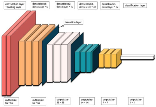 DenseNet (Densely Connected Convolutional Network) is a deep neural network architecture, which is designed based on the concept of densely connecting each layer to every other layer in a feedforward manner. This connectivity pattern allows for efficient information flow and feature reuse throughout the network. The architecture of DenseNet-169 is depicted in Figure 5. DenseNet-169 consists of a conventional layer with a kernel size of 7 × 7, a pooling layer with a size of 3 × 3 for maximum pooling, four dense blocks with a transition layer between each pair of blocks, and a classification layer. Each dense block contains multiple conventional groups, which are composed of two conventional layers with kernel sizes of 1 × 1 and 3 × 3. The four dense blocks have different numbers of conventional groups, specifically 6, 12, 32, and 32. The transition layer is responsible for reducing computational complexity and consists of a conventional layer with a kernel size of 1 × 1 and a pooling layer with a size of 2 × 2 for average pooling. Finally, the classification layer includes a pooling layer with a size of 7 × 7 for global average pooling, a fully connected layer, and a softmax function layer to obtain the final result.
