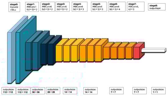 EfficientNet is a family of deep neural network architectures. These architectures are constructed using a compound scaling method that simultaneously scales up the depth, width, and resolution of the network. Among the variants of EfficientNet, EfficientNet-B0 is the smallest, possessing fewer parameters and lower computational complexity compared to its larger counterparts. Figure 6 illustrates the division of EfficientNet-B0 into nine stages. The initial stage consists of a standard convolutional layer with a kernel size of 3 × 3, including batch normalization (BN) and the Swish activation function. Stages 2 to 8 involve the repetition of MBConv structures, while stage 9 comprises an ordinary 1 × 1 convolutional layer (including BN and Swish), an average pooling layer, a fully connected layer, and a softmax function layer. The MBConv structure itself consists of a 1 × 1 ordinary convolutional operation (which raises the dimensionality, including BN and Swish), a k × k (3 × 3 or 5 × 5) depthwise convolution (including BN and Swish), an SE module, a 1 × 1 ordinary convolution (which reduces dimensionality, including BN), and a dropout layer.