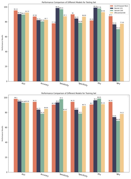 Performance comparison of GLCM-based FBLS and three CNN models for testing set and training set.