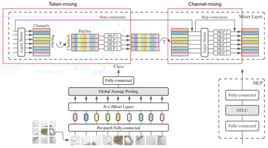 Each unique patch has identical dimensions. The number of patches is calculated by dividing the input dimensions by the patch resolution (P, P), . The sequence of non-overlapping patches is projected into an embedding space with dimension C, resulting in a matrix of dimensions . The layers in the Mixer are all the same size and are made up of two MLP blocks each.