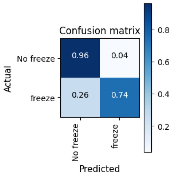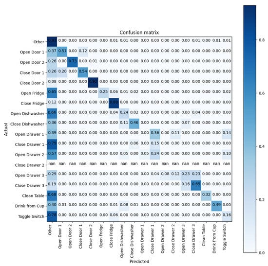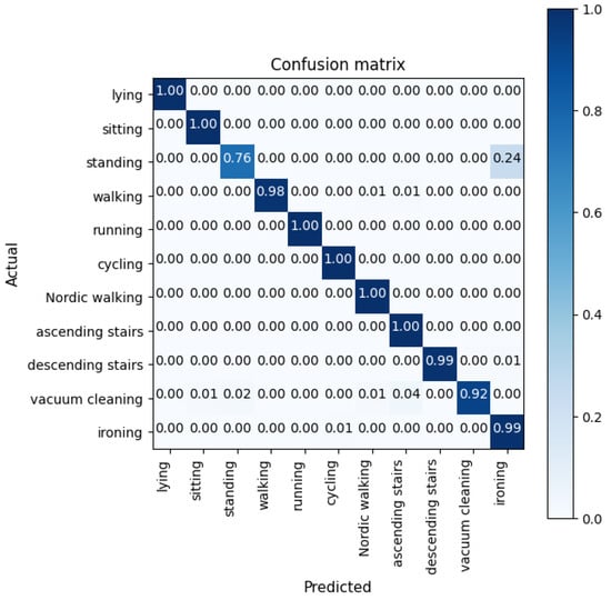 The normalised confusion matrices of the PAMAP2, Opportunity, and Daphnet datasets are illustrated in Figure 2, Figure 3 and Figure 4, respectively. The model’s ability to distinguish between activities in the PAMAP2 confusion matrix showed that it had learned the various spatial and temporal characteristics of each activity. The model did have some trouble distinguishing between the “ironing” and “standing” activities; this is probably because the sensor data for these actions are similar in the chest and ankle regions but only slightly different in the hand regions. With further inspection, standing consisted of talking while gesticulating, further validating the possibility of similarities in the hand sensors. Furthermore, the model had little trouble differentiating between “walking”, “vacuum cleaning”, and “descending stairs” activities; this is understandable since it mistook these activities for similar ones.