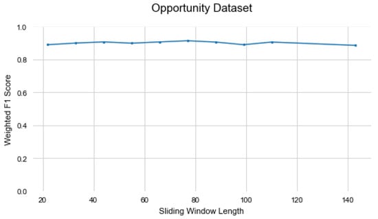 Each dataset contains a different range of activity lengths and repetition rates. The sliding window length has a significant impact depending on how long the activities are in the dataset. The sliding window’s parameters were altered to study its effect on the Mixer performance. The model’s parameters were fixed, and the step size was constant instead of using an overlap percentage of the window length to prevent the number of samples from affecting the results. Small window intervals contain insufficient data for the Mixer to learn from and make decisions. On the other hand, if the sliding window interval is large relative to the activities in the window, it allows information from multiple activities to be present in a single sliding window, making it harder for the Mixer to determine which activity the sliding window represents among the multiple activities.