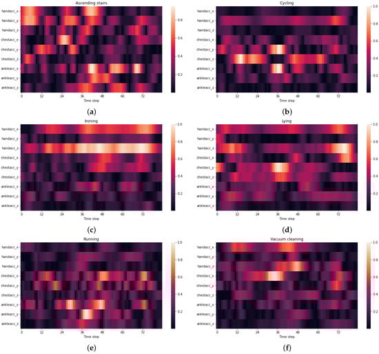 The Mixer’s weight visualisation for each accelerometer sensors in the sliding window. Each figure represents a different activity: (a) Ascending stairs, (b) cycling, (c) ironing, (d) lying, (e) running, and (f) vacuum cleaning.