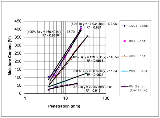 At various moisture contents, the test measured the penetration in mm. Semi-log charts can be used to display this relationship. Comparing the curve’s trend with the curves of different materials is possible [15].