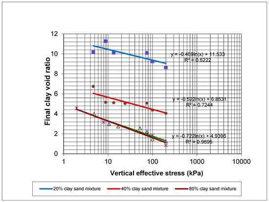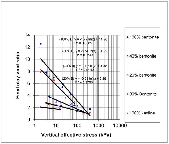 Final clay void ratio versus vertical effective stress for bentonite–kaolin mixtures.