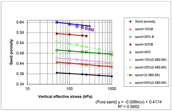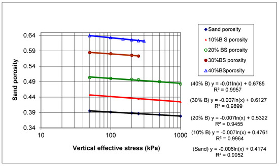The test results obtained for the fall cone method were used to construct the chart presented in Figure 3. The clay void ratio versus the vertical effective stress for the selected bentonite–kaolin mixtures is presented in Figure 4. No prediction formula is given for the pure kaolinite in Figure 4. The laboratory porosity measurements carried out using the oedometer apparatus are presented in Figure 5 and Figure 6. Trends in the artificial clay-sand mixtures are shown in Figure 7.