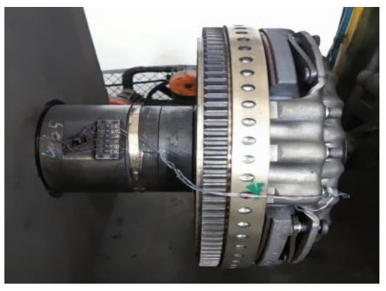 The LZDZX-430A heavy-duty vehicle clutch assembly multifunctional performance test bench was used for the Φ430 dry clutch assembly. The bench consists of an electric control cabinet, oil supply station, lifting arm, operator console, test chamber, active components, and driven components, as shown in Figure 1. Thermocouples are embedded at a downward depth of 0.2–0.3 mm from the surface of the pressure plate and located in the outer, middle, and inner diameters of the pressure plate, respectively. Figure 2 shows the installation of the clutch assembly with K-type nickel-chromium/nickel-silicon thermocouples on the rig test bench.