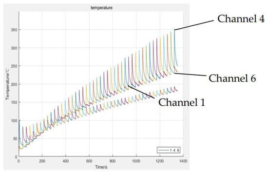 For general purposes, the fifth test batch labeled with batch A is selected for the thermal modeling. In this A group test, three temperature channels labeled 1, 4, and 6 are monitored, where channel 1 is located at the outer diameter of the pressure plate, channel 4 is at the middle diameter, and channel 6 is at the inner diameter of the pressure plate. The test undergoes 45 cycles of continuous engagement and disengagement tests, with each cycle lasting 30 s. The total accumulated time is 1400 s. The complete temperature profile of the A group is shown in Figure 3. From Figure 3, it is shown that as the engagement increases, the temperature of the clutch increases. The maximum temperature of the assembly is up to 350 °C at the last cycle. In the initial stage, the maximum temperature is in channel 1 at the outer diameter; however, in the later stage, the maximum temperature is in channel 4 at the middle diameter.