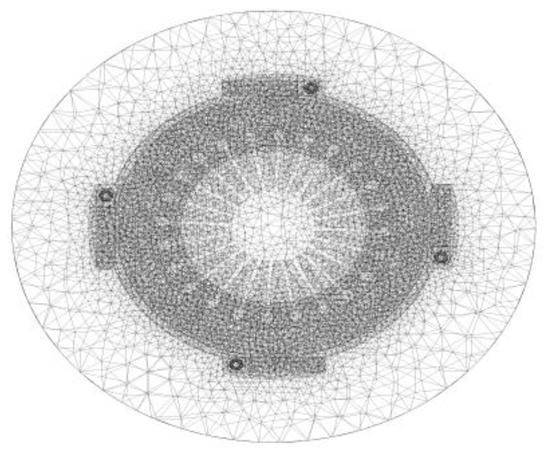 The dry clutch assembly model contains the pressure plate, diaphragm springs, rivets, and transmission plates. To determine the convective heat transfer coefficient of the dry clutch assembly with the ambient air under different angular velocities, the enclosure tool in SCDM code is used to create the external flow field region of the clutch. A cylindrical shape is set to simulate the spatial domain of the fluid, as shown in Figure 4. The entire assembly is meshed using tetrahedral unstructured grids, with a total of 59,642 nodes and 340,175 elements. The mesh partitioning effect is shown in the diagram below, in Figure 5.