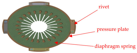 For the pressure plate, rivets, and bolt, the hexahedral element is used in the meshing of the model of the clutch assembly to improve accuracy. For the diaphragm springs and the transmission plates, the tetrahedral element is the only option to use in the meshing because of its complex structure. The whole FE model consists of 253,280 nodes and 73,814 elements, as shown in Figure 6 and Figure 7, respectively.