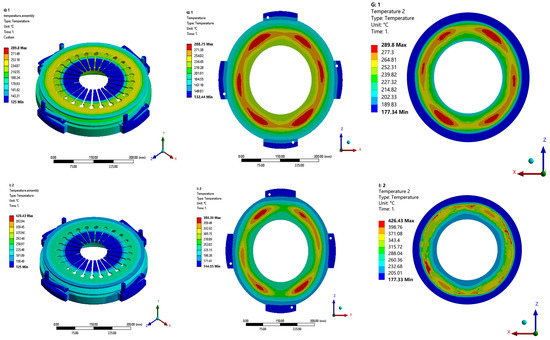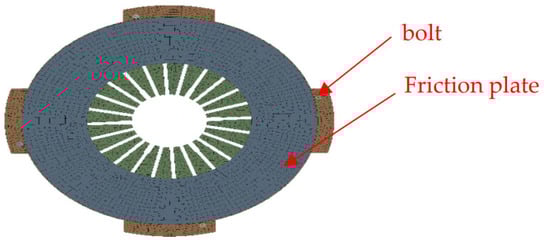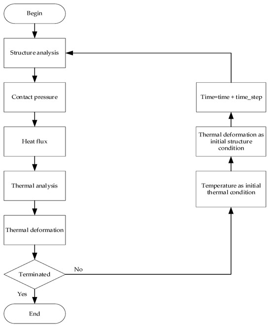 For reducing the computational resource and achieving long-scale simulation, the thermal-structure bidirectional coupling is decoupled with two steps of sequential unidirectional coupling. In the first step, the structure analysis of the clutch assembly is performed under the normal clamp force of the clutch. The contact pressure of the friction surface of the pressure plate is obtained. The time step of the simulation is specified, for example, 0.1 s during the engagement sliding process, and a time step of 1 s is specified during the disengagement process. Within the time-step-specified range, the contact is assumed to remain unchanged. Then the frictional heat generated can be easily calculated based on the contact pressure. Then, applying the heat flux to the surface of the pressure plate, the thermal analysis of the clutch assembly is conducted. The thermal deformation of the pressure plate is achieved correspondingly. In the second step or the next time step, the structure analysis of the deformed clutch assembly under the normal clamp fore of the clutch is performed successively, where the deformation of the pressure plates by the previous step is applied in the model as the initial displacement condition. And the contact pressure and heat flux of the deformed clutch plate are conducted as the first step. Then the thermal analysis of the clutch assembly is performed successively, where the temperature distribution from the previous step is applied to the model as the initial thermal condition. These two steps are repeated until the running time reaches the set value. The regulation of the time step in the simulation can compromise the accuracy and computational resource of the simulation. The following Figure 8 illustrates the flow of the decoupling technique.