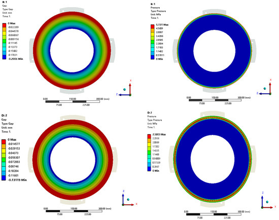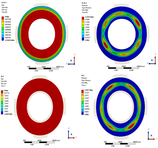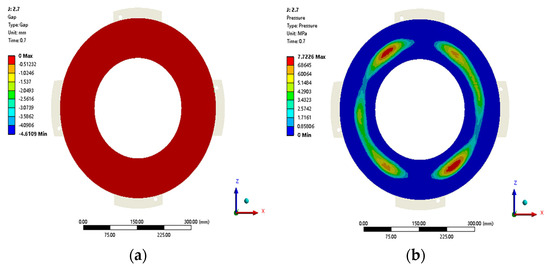 The contact between the friction pairs of the clutch first occurs in the maximum outer diameter region, then the contact gradually expands from the outer ring towards the center during the engagement sliding process, as shown in Figure 11. Figure 11 depicts the contact gap (a) and contact pressure (b) contour plots on the friction surface. This contact state evolution agrees well with the engineering experience.