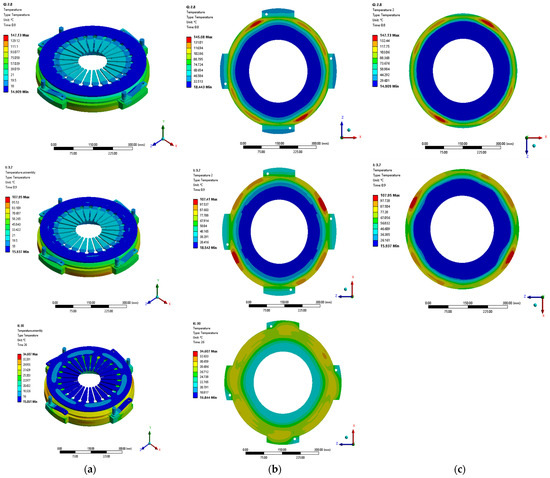 As heat is generated from the friction between the friction pairs, the outer diameter of the pressure plate quickly heats up, while the middle and inner diameters, due to the slight concavity of the pressure plate’s friction surface, do not initially come into contact with the friction disc. Instead, a minor temperature increase in this region is primarily achieved through internal heat transfer within the clutch assembly. Figure 12 represents the temperature field contour map of the clutch assembly during the initial 30 s of engagement and disengagement. Figure 12a represents the temperature contour map of the dry clutch assembly, (b) represents the temperature contour map of the pressure plate’s friction surface, and (c) represents the temperature contour map of the friction disc’s friction surface. It can be observed from Figure 12 that the temperature difference between the monitoring points on the outer, middle, and inner diameters of the pressure plate’s friction surface gradually increases. The peak temperature of the assembly is 147.13 °C, occurring in the final stage of sliding, and after the heat dissipation during disengagement, the highest temperature drops to 34.61 °C.