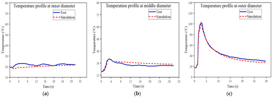 Temperature profiles of the simulation and the test for the first cycle at the points of (a) the inner diameter, (b) the middle diameter, and (c) the outer diameter, respectively.