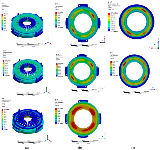 Temperature field of the clutch during the 45th engagement. (a) the temperature contour map of the dry clutch assembly. (b) the temperature contour map of the pressure plate’s friction surface. (c) the temperature contour map of the friction disc’s friction surface.