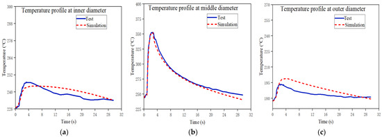 Figure 13 shows the temperature profiles of the simulation and the test for the first cycle at the points of the inner diameter (a), middle diameter (b), and outer diameter (c), respectively. It can be seen from Figure 13 that for these three monitor points, the temperatures of the simulation agree well with those of the test.