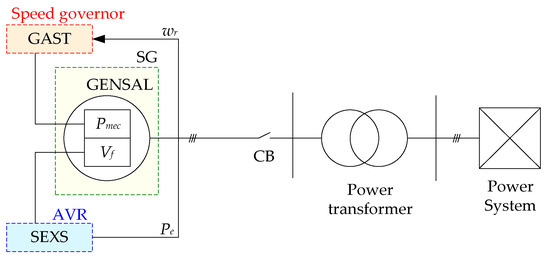 In Figure 1, the models used in simulations and their correlation are plotted. The theoretical model consists of the SG as GENSAL, which produces as outputs the electrical power (Pe) and the rotor speed (wr), the speed governor as GAST, whose output is mechanical power (Pmec), and the AVR as SEXS, whose output is the field voltage (Vf). Each of the models is described in more detail below.